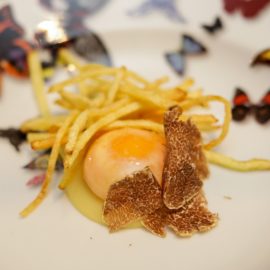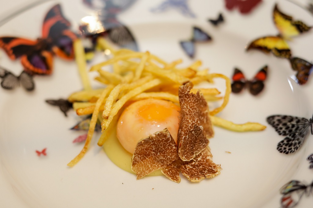 Un salto en el espacio y en el tiempo, hacia posiciones vanguardistas, nos lleva hasta un restaurante en clara línea ascendente, Coque. Allí se ofrece una revisión de ese plato como merecido homenaje al saber hacer y estar de un hombre que ha marcado la historia reciente de la hostelería madrileña: Lucio Blázquez. En primer lugar porque Mario Sandoval, cocinero que dirige el restaurante junto con sus hermanos Rafael (sumiller) y Diego (jefe de sala), se ha convertido en el embajador de Viña Pomal. En segundo, porque Casa Lucio se ha incorporado como socio número cien a la Sociedad Viña Pomal Compromiso. Una alianza “por la gastronomía de calidad, la excelencia y el respeto por la tradición y el origen en el plato y en la copa” de la que forman parte restaurantes como Arzak, Etxebarri, Zuberoa, Echaurren o Alabaster.